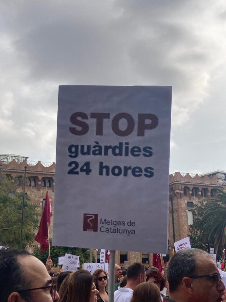 Les guàrdies de 24 hores, obligatòries en la professió mèdica i moltes vegades cobrades per sota del preu/hora de la jornada ordinària, són l’altre cavall de batalla del col·lectiu. Referent a aquest tema, Lleonart considera que “poc a poc la jornada complementària ha de desaparèixer i s’ha de caminar cap a jornades de, com a molt, 12 hores”. Irene Vermell va afegir que “s’està perpetuant un model de guàrdies insostenible. Aquestes 24 hores a l’Estatut Marc les volen fixar en 17 hores, però si llegeixes la lletra petita, hi posa que ‘per necessitats del servei aquestes 17 hores es poden allargar fins a les 24’. Per tant, ens quedem exactament igual. Portem dècades aguantant jornades maratonianes, i això posa en risc la seguretat dels malalts”.